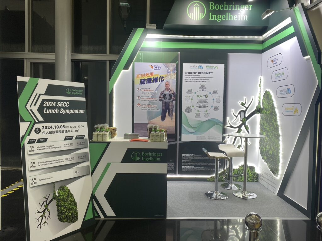 1.現代科技與專業形象結合:這個展位使用了森林綠(Forest Green)、白、萊姆綠(LimeGreen)等簡潔的色彩搭配,給人一種專業且現代的氛圍。色彩上強調了品牌的穩重和專業,並且突顯了Boehringer Ingelheim科技導向的形象。